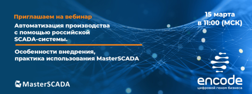 15 марта в 11:00 группа компаний ENCODE проведёт вебинар «Автоматизация производства с помощью российской SCADA-системы. Особенности внедрения, практика использования MasterSCADA».